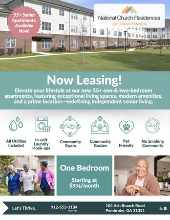 Welcome to Ash Branch Manor, a budget-friendly senior apartment community in Pembroke, GA, designed for individuals aged fifty-five and older. We offer spacious one- and two-bedroom floor plans starting at just $934, with all utilities included-plus free Wi-Fi! Each apartment features bright, open layouts, fully equipped kitchens, and washer/dryer hookups for added convenience. Income guidelines apply.